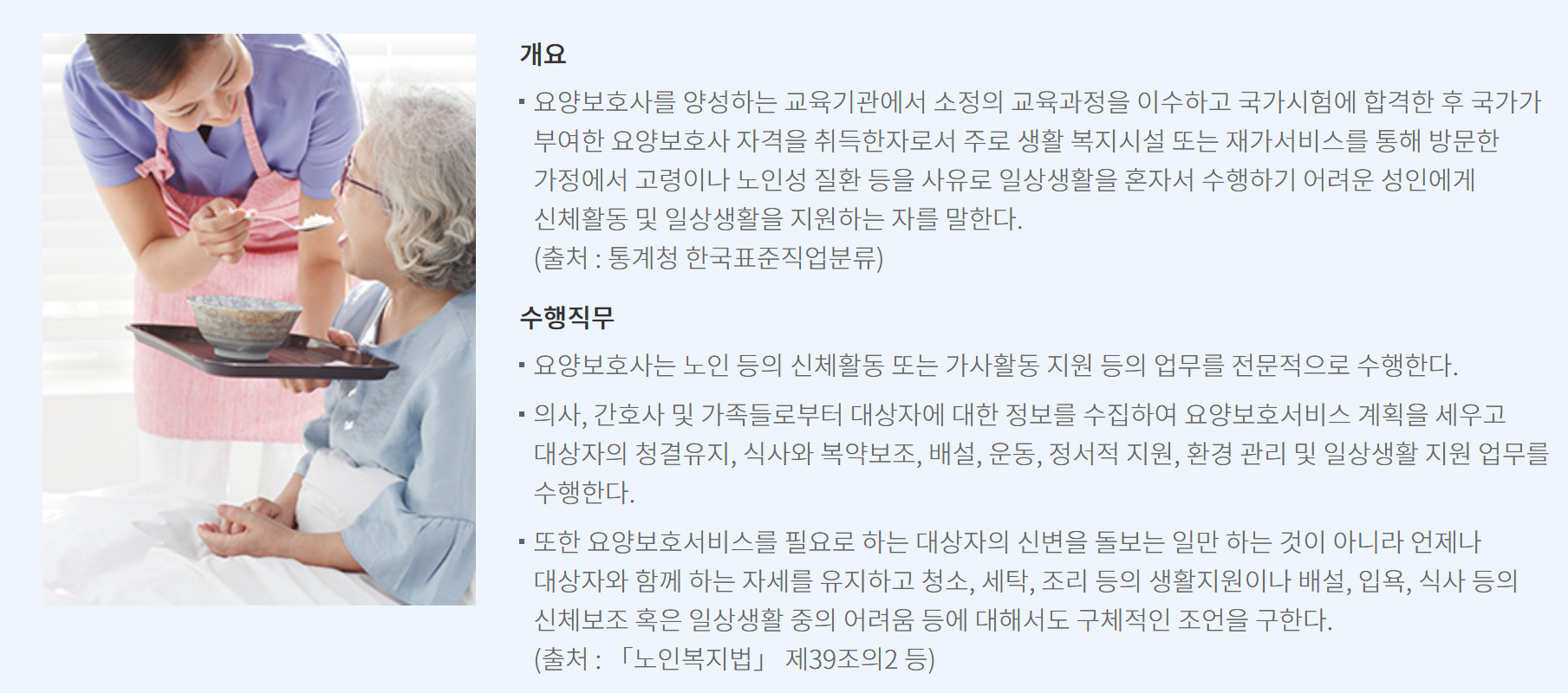 | 방문요양 | 대상자 케어 특성에 따라 업무 달라짐 | 상황 대처(낙상/응급) 자신 있게 설명 |